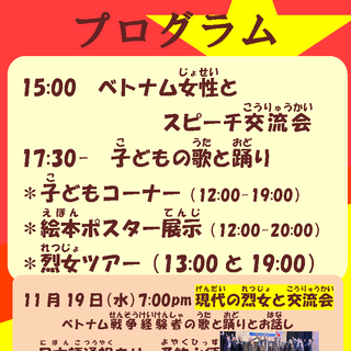 11月15日(土)12:00-20:00 ベトナム烈女展当日プログラム 来てね 15日(土)12:00-20:00 絵本やポスター展示など 出入り自由 12:00 オープン 13:00 烈女歴史ツアー 15:00 スピーチ交流会「ベトナム女性」 17:30 ベトナムの歌と踊り 19:00 烈女歴史ツアー 前の記事 次の記事
